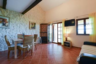 The interior space consists of a living room (with a double bed), bedroom (double bed), kitchen and bathroom. There is also the possibility of additional beds if they are needed. Kitchen is fully equipped. Use of air conditioners and flat Wifi internet is included in the price.